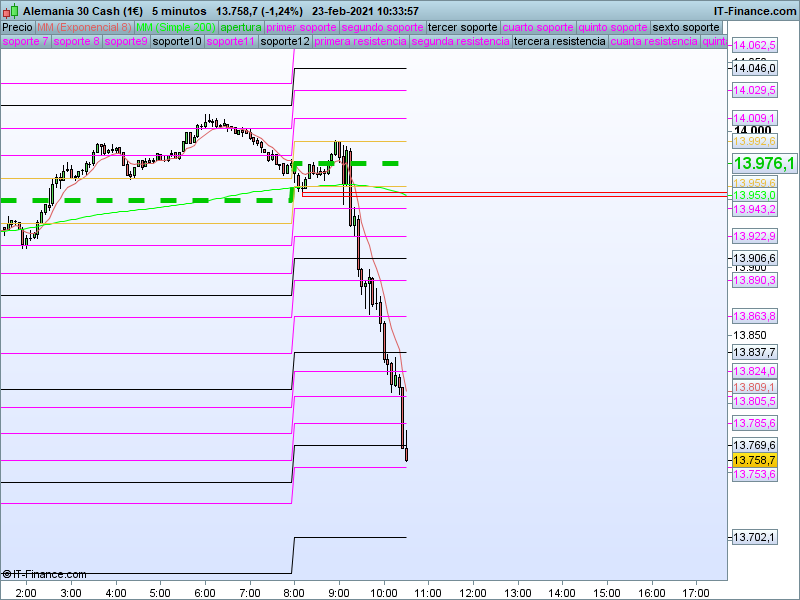 Caida muy vertical la que estamos viendo esta mañana que nos ha llevado hasta el tercer nivel intradia. Por debajo tenemos el precio de apertura anual, 13720 como siguiente nivel en importancia.