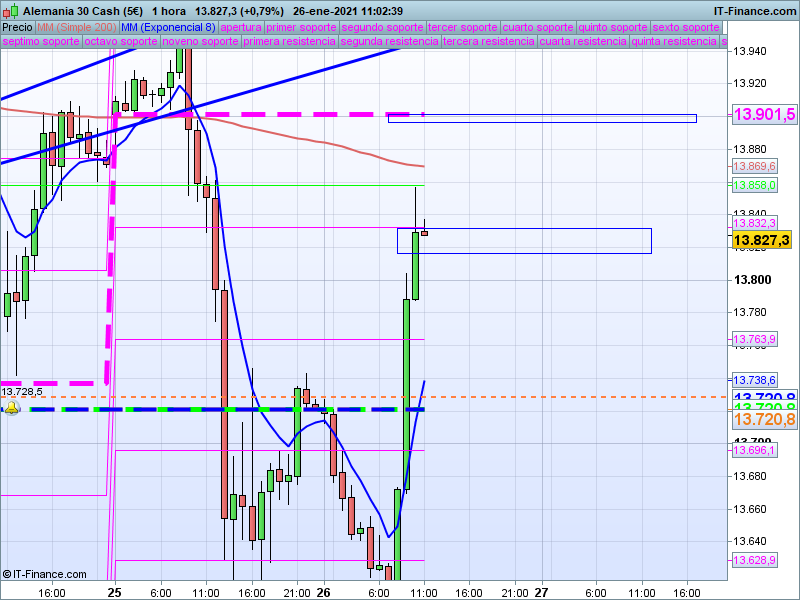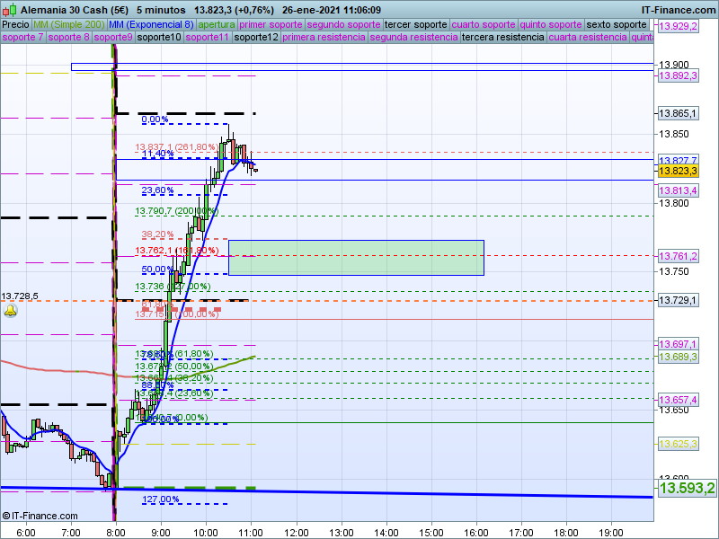 Se trata de un seguimiento exhaustivo del índice alemán DAX30 bajo un enfoque de muy corto plazo en gráficos de 5 minutos en el que utilizamos todos nuestros recursos técnicos y en donde propondremos alternativas, objetivos y recorridos de máxima probabilidad en función del movimiento que el precio vaya desarrollando durante el día.
