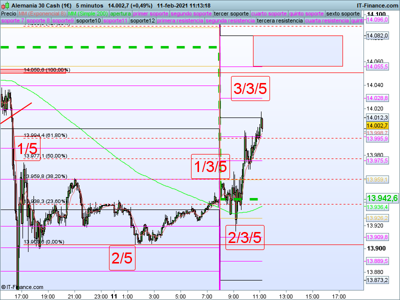 Se trata de un seguimiento exhaustivo del índice alemán DAX30 bajo un enfoque de muy corto plazo en gráficos de 5 minutos en el que utilizamos todos nuestros recursos técnicos y en donde propondremos alternativas, objetivos y recorridos de máxima probabilidad en función del movimiento que el precio vaya desarrollando durante el día.