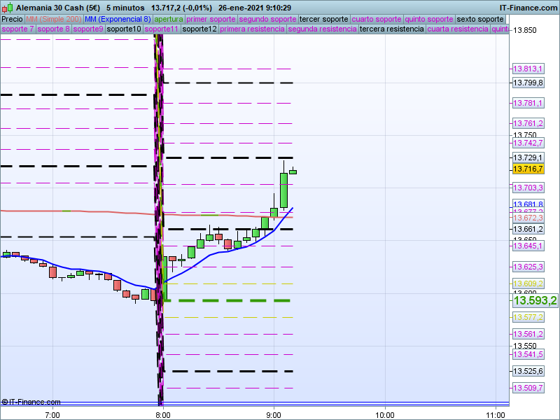 Se trata de un seguimiento exhaustivo del índice alemán DAX30 bajo un enfoque de muy corto plazo en gráficos de 5 minutos en el que utilizamos todos nuestros recursos técnicos y en donde propondremos alternativas, objetivos y recorridos de máxima probabilidad en función del movimiento que el precio vaya desarrollando durante el día.
