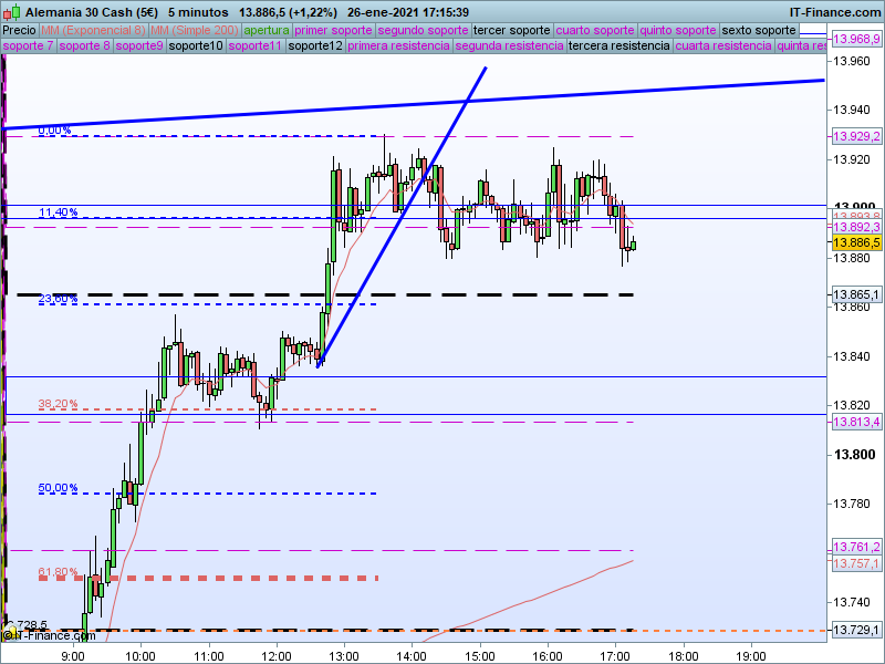 Se trata de un seguimiento exhaustivo del índice alemán DAX30 bajo un enfoque de muy corto plazo en gráficos de 5 minutos en el que utilizamos todos nuestros recursos técnicos y en donde propondremos alternativas, objetivos y recorridos de máxima probabilidad en función del movimiento que el precio vaya desarrollando durante el día.