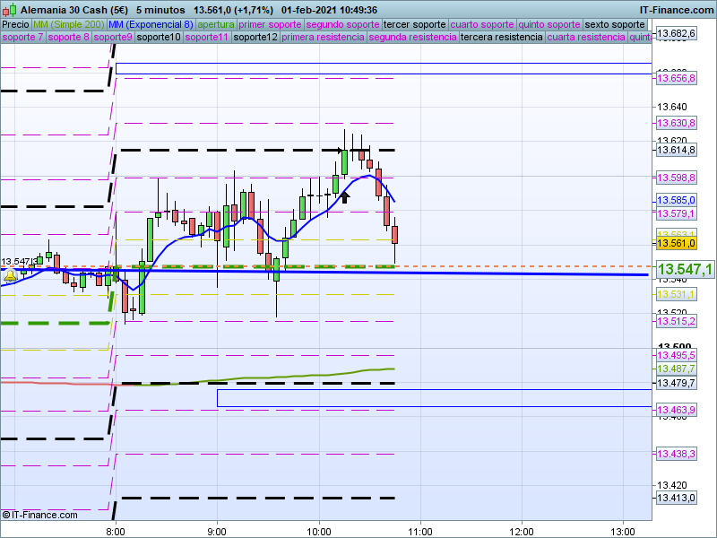 Se trata de un seguimiento exhaustivo del índice alemán DAX30 bajo un enfoque de muy corto plazo en gráficos de 5 minutos en el que utilizamos todos nuestros recursos técnicos y en donde propondremos alternativas, objetivos y recorridos de máxima probabilidad en función del movimiento que el precio vaya desarrollando durante el día.