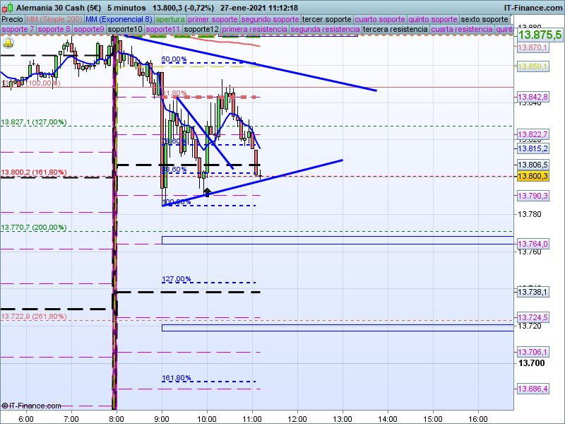 Se trata de un seguimiento exhaustivo del índice alemán DAX30 bajo un enfoque de muy corto plazo en gráficos de 5 minutos en el que utilizamos todos nuestros recursos técnicos y en donde propondremos alternativas, objetivos y recorridos de máxima probabilidad en función del movimiento que el precio vaya desarrollando durante el día.