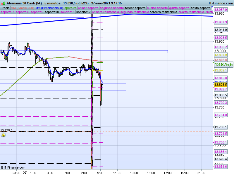 Se trata de un seguimiento exhaustivo del índice alemán DAX30 bajo un enfoque de muy corto plazo en gráficos de 5 minutos en el que utilizamos todos nuestros recursos técnicos y en donde propondremos alternativas, objetivos y recorridos de máxima probabilidad en función del movimiento que el precio vaya desarrollando durante el día.