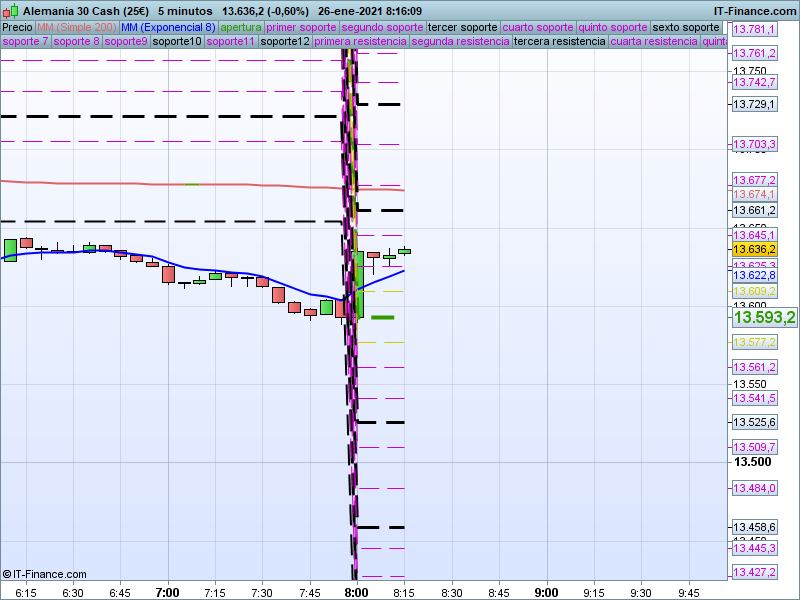 Se trata de un seguimiento exhaustivo del índice alemán DAX30 bajo un enfoque de muy corto plazo en gráficos de 5 minutos en el que utilizamos todos nuestros recursos técnicos y en donde propondremos alternativas, objetivos y recorridos de máxima probabilidad en función del movimiento que el precio vaya desarrollando durante el día.