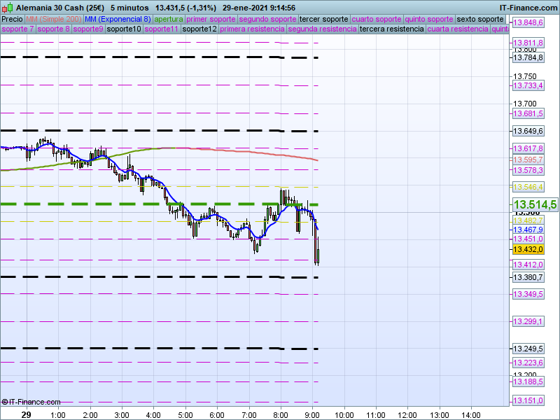 Se trata de un seguimiento exhaustivo del índice alemán DAX30 bajo un enfoque de muy corto plazo en gráficos de 5 minutos en el que utilizamos todos nuestros recursos técnicos y en donde propondremos alternativas, objetivos y recorridos de máxima probabilidad en función del movimiento que el precio vaya desarrollando durante el día.