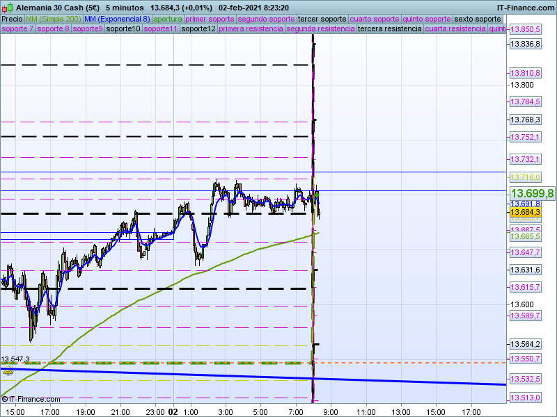 Se trata de un seguimiento exhaustivo del índice alemán DAX30 bajo un enfoque de muy corto plazo en gráficos de 5 minutos en el que utilizamos todos nuestros recursos técnicos y en donde propondremos alternativas, objetivos y recorridos de máxima probabilidad en función del movimiento que el precio vaya desarrollando durante el día.