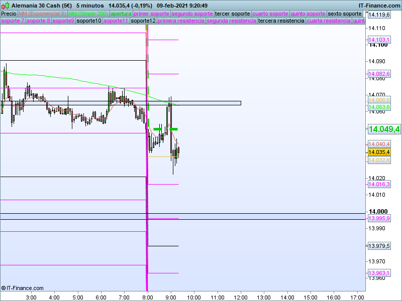 Se trata de un seguimiento exhaustivo del índice alemán DAX30 bajo un enfoque de muy corto plazo en gráficos de 5 minutos en el que utilizamos todos nuestros recursos técnicos y en donde propondremos alternativas, objetivos y recorridos de máxima probabilidad en función del movimiento que el precio vaya desarrollando durante el día.