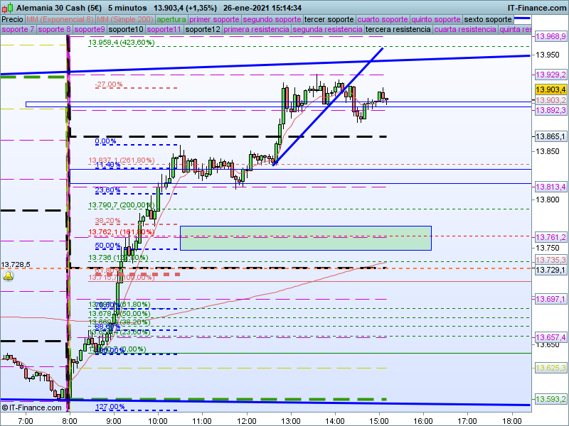 Se trata de un seguimiento exhaustivo del índice alemán DAX30 bajo un enfoque de muy corto plazo en gráficos de 5 minutos en el que utilizamos todos nuestros recursos técnicos y en donde propondremos alternativas, objetivos y recorridos de máxima probabilidad en función del movimiento que el precio vaya desarrollando durante el día.