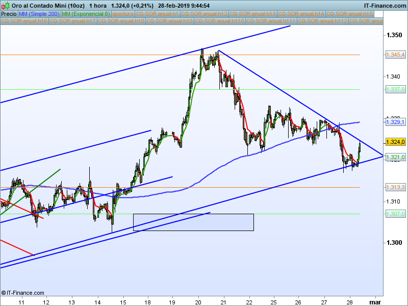 Seguimos dentro de un movimiento lateral que no nos interesa. En estos momentos hemos encontrado algo de soporte en la LT alcista. Punto de reversión en SOR 1313