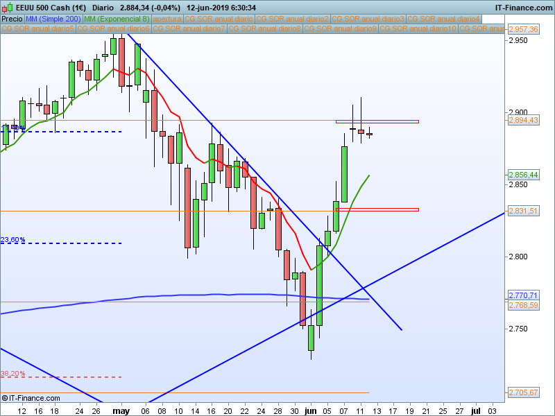 El SP500 es el índice de referencia dentro de las bolsas mundiales. Durante esta semana ya hemos comentado que este primer movimiento al alza post mayo está maduro y ayer, por segunda jornada consecutiva intentó avanzar por encima de los 2900 sin conseguirlo de nuevo. El índice americano se mostró incapaz de alcanzar la zona de los 2917 (nivel trimestral) y se giró para cerrar por debajo del SOR anual 2894 dibujando un claro patrón de giro en zona relevante.