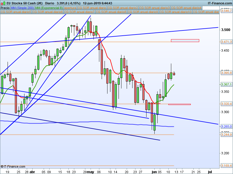 Cierre de ayer justo en el 3395 mostrando cierto rechazo por arriba. Mientras estemos por debajo vamos a considerar que podemos desplegar un movimiento correctivo donde la zona a vigilar será de nuevo el SOR 3320