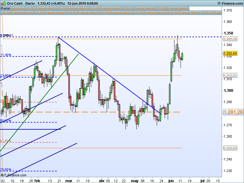 Seguimos dentro del proceso correctivo tras haber alcanzado el primer objetivo en SOR 1345, la estructura sigue siendo alcista, nos ponemos como referencia por abajo el SOR 1313