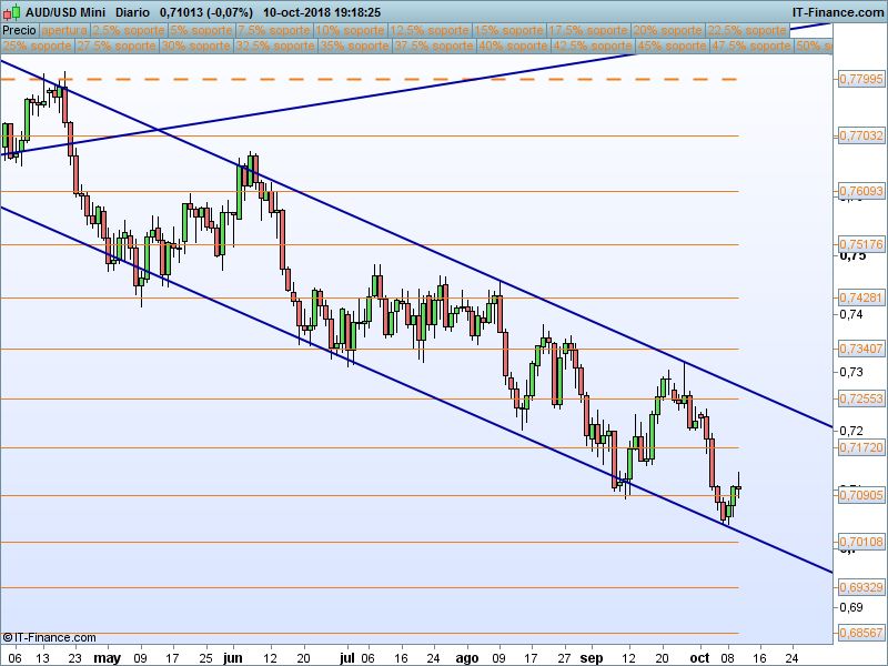 AudUsd.- La semana pasada propusimos la extensión hasta el 0.70108 que finalmente no se ha producido al rebotar el precio en la base del canal bajista. Con cierres por encima de 0.70905 podríamos ir a a buscar la parte alta del canal , con un primer objetivo en el SOR anual 0.7172 y extensión en 0.72553. Habría que analizar el comportamiento del precio una vez estemos en esa zona.