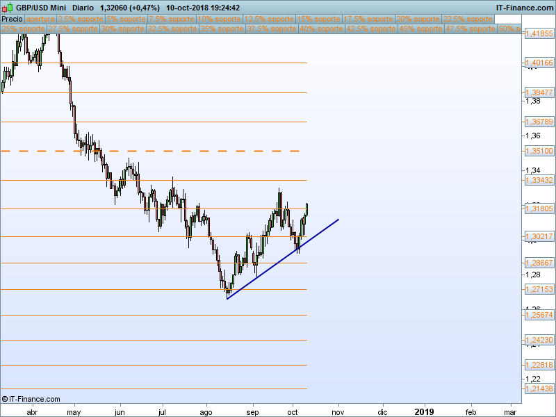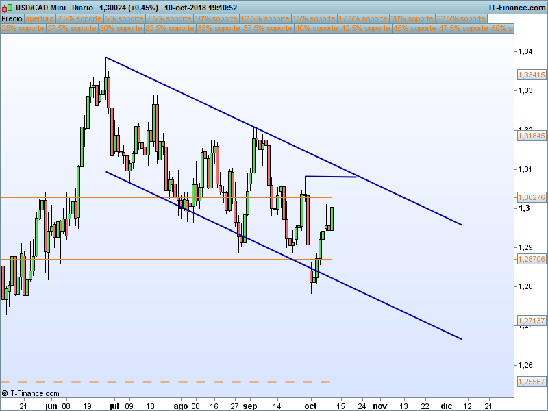 UsdCad.- Tiene muy cera el SOR anual 1.30276. Tenemos la LT bajista que nos encontraremos en caso de cerrar por encima de esta cota. En caso de ruptura con cierre por encima podríamos plantear un recorrido hasta el SOR 1.33415. En caso de rebote en la parte superior del canal, podríamos buscar de nuevo el 1.28706 a partir del cierre por debajo del 1.30276 tras rebote.