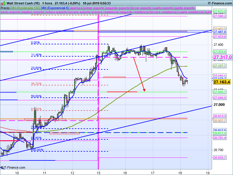 Bajando a gráficos de H1, vemos como tenemos una clara diferencia estructural de este índice respecto al SP500, que debemos considerar principal. Dentro de los 4 escenarios que teníamos planteados desde el lunes finalmente se activó el que está marcado en rojo. En este momento estamos exactamente en zona de retroceso del 38.2%, mientras estemos por debajo del SOR semanal 27181, y a muy corto plazo, vamos a marcar como primer objetivo el SOR mensual 27084, por aquello de la continuidad de SORs. Como decimos, los puntos importantes que no deben perderse para que podamos seguir adoptando predisposición alcista son el SOR anual 26907 y el precio de apertura trimestral 26817. Por arriba, en caso de volver al precio de apertura semanal (27317), vamos a tener un objetivo muy claro en el SOR anual no cerrado, el 27492.