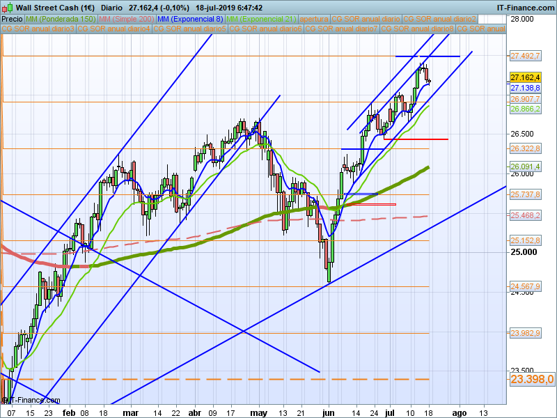 El alcance del SOR anual 27493 se resiste, es el único de los tres grandes índices americanos que no alcanzó aún la zona de objetivo relevante. En gráfico diario mantendremos predisposición alcista en tanto en cuanto no tengamos cierres por debajo del SOR 26907.