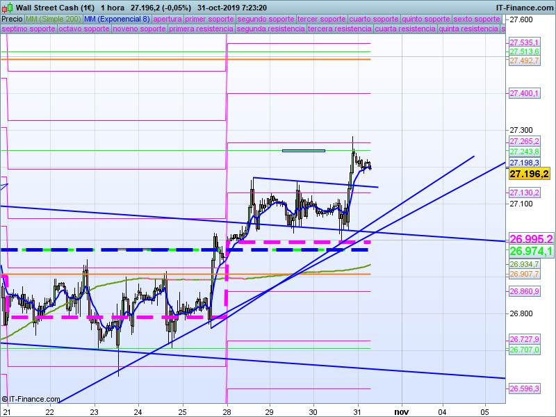 Si bajamos a gráficos de H1 (nuestro principal), ayer vimos una vez más un movimiento de alta precisión, primero viniendo a buscar de forma milimétrica al precio de apertura semanal en 26995 para a continuación, tras la comparecencia de Powell ir a alcanzar el objetivo que teníamos propuesto para la sesión de ayer, el SOR mensual 27243. A este respecto cabe recordar que hoy finaliza el mes de octubre y, por tanto, para mañana habrá que cambiar los niveles calculados para esta temporalidad.