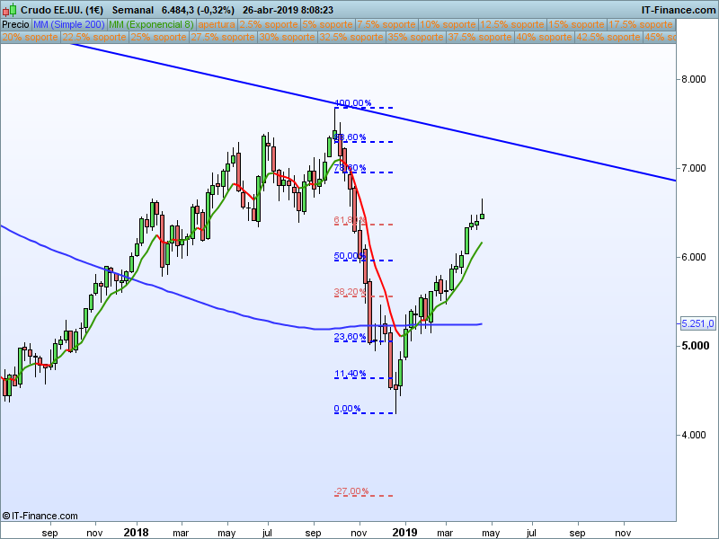 Respecto a las commodities, movimiento también interesante en el crudo WTI. El cierre de vela de esta semana va a ser muy revelador, de momento este es el dibujo que presenta. Recordamos que estamos en zona importante del 61.8% del retroceso del anterior impulso bajista y que hasta el momento no hemos tenido ninguna corrección importante.