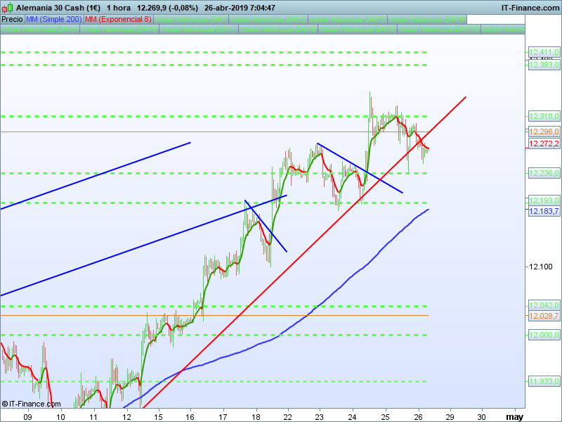 En Europa, sesión desigual. por un lado el DAX perdiendo por momentos el SOR 12296 que será la prueba de fuego que habrá que salvar en el día de hoy. Recordamos que en el índice alemán el punto de reversión lo tenemos situado en el refugio 12193.