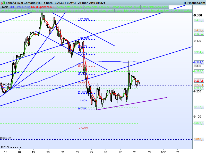 Movimiento muy brusco ayer por declaraciones del BCE que favorecieron mucho a la banca. Estamos en el SOR 9225. El estirón llegó hasta el test de la LT alcista. Veremos que hacemos en este nivel.