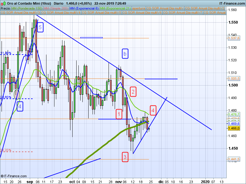 Lo cierto es que para confirmar la finalización de la onda 4 y el comienzo de un nuevo tramo al alza pedíamos por un lado cierres diarios por encima del SOR anual 1473 y por otro lado la perforación en tiempo y forma de la línea 0B que hemos dibujado en azul.