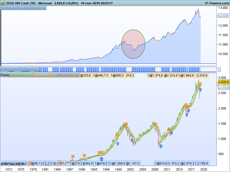 Con este sistema corremos el riesgo de tener sustos importantes, puesto que puede darse el caso de tener entrada en falso que no tendría opción de ser cerrada por el stop de la media de 17, como vemos en el círculo. Tampoco es oro todo lo que reluce.