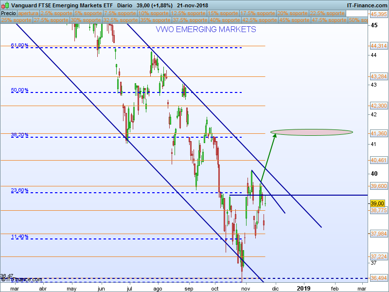Mercados Emergentes.- Seguimos con la estructura intacta en el ETF VWO Vanguard FTSE Emerging Markets. Tenemos trazada una 0B que nos abre la puerta a una corrección mayor dentro de la clara tendencia bajista que traemos. Cierres por debajo del SOR 37.98 cancelan la propuesta.
