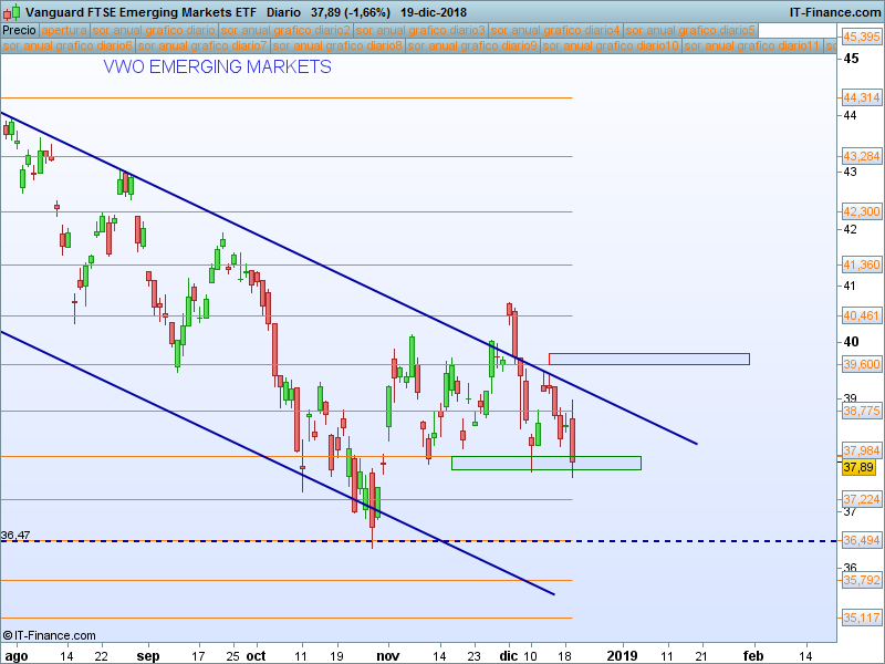 Un dólar débil beneficia claramente a los países emergentes por varios motivos, sin embargo parece que el miedo a la desaceleración global está pesando más en las cotizaciones del índice de emergentes, en nuestro caso el ETF VWO en donde seguimos esta evolución.