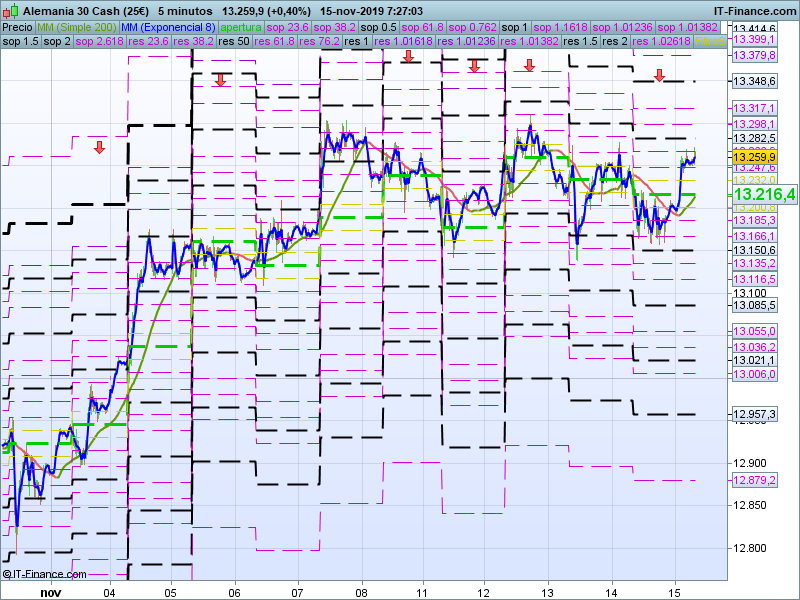 Cuando antes hablaba de que esta situación perjudica seriamente al trader, me gustaría compartir con ustedes el siguiente gráfico. Es una captura de un gráfico de 5 minutos del DAX en donde está cargado el complejo SOR intradiario, la herramienta principal que utilizo para el trading intradia. Los compañeros del Club de Bolsa se habrán cansado ya de escucharme decir lo extraño que es que este índice no alcance durante una sesión al menos uno de los niveles marcados en color negro, ya sea por arriba o por debajo del precio de apertura. Durante octubre hablamos de esta rareza, que curiosamente se produjo en 3 sesiones en dicho mes. En el gráfico mostramos la evolución desde primeros de noviembre, y hemos marcado con una flechita roja los días en donde no se ha conseguido alcanzar al menos una de esas cotas. Efectivamente, 6 ocasiones, y eso que estamos a mitad de mes.