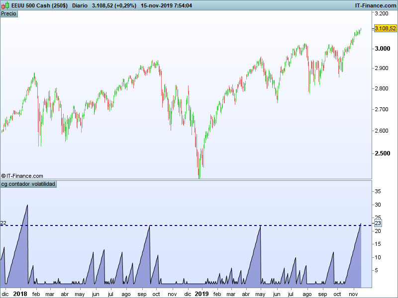 Vemos que, contando con lo poco que llevamos de día, hemos alcanzado 23 sesiones consecutivas de baja volatilidad. Si miramos en el gráfico hacia la izquierda podemos ver lo que ha ocurrido en el mercado cuando se han alcanzado cotas similares en cuanto a sesiones consecutivas de escaso rango de negociación.