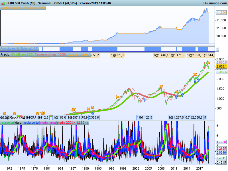 Como este concepto lo queremos aplicar al largo plazo, partiremos de gráficos semanales, y vamos a poner la siguientes restricciones, muy simples: comprar cuando la volatilidad de este activo en este timeframe esté por debajo del 3% (en la tabla de arriba veíamos que la volatilidad endógena media para este activo estaba alrededor del 1.86%) y vender si la volatilidad semanal sube por encima de este nivel.