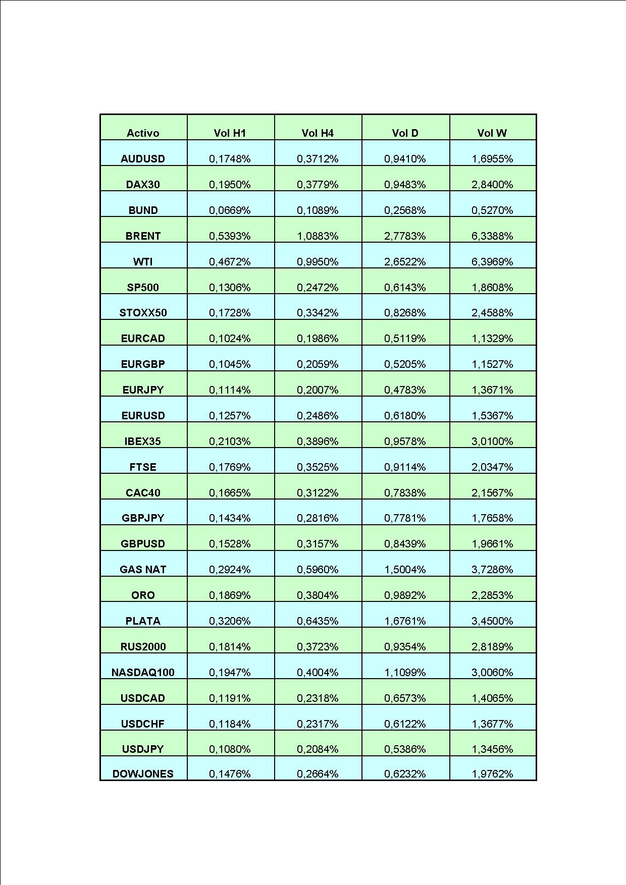 La vol. endógena la definimos como la propia de cada activo, independientemente de que en un momento dado ese dato de volatilidad sea más alto o más bajo. Todos sabemos que los cruces de divisas tienen una menor volatilidad que los índices, por ejemplo, y que estos a su vez tienen menor rango de movimiento que las acciones. Hace unos meses publicamos una tabla al respecto en este artículo en el que mostrábamos la volatilidad media de cada activo según el time frame. Aunque los datos no están actualizados, puede servirnos de ejemplo: