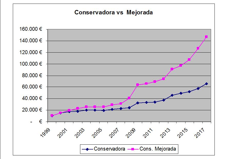 Llegados a este punto, se nos ocurre una pregunta ¿y si aplicamos estas mejoras sobre la estrategia conservadora que propusimos la semana pasada?. Parece lógico que si hemos podido suavizar enormemente las pérdidas de la estrategia original, podamos hacer lo propio con la opción conservadora.