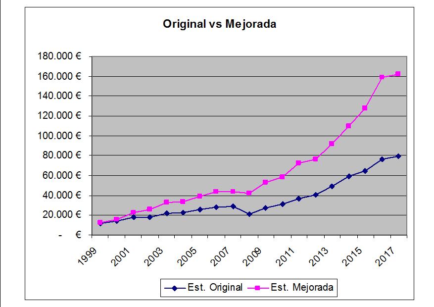 Puesto que ya demostramos que la estrategia original mejoraba bastante a la inicial buy&hold, el siguiente gráfico refleja la diferencia entre la estrategia «agresiva» original y esta nueva estrategia mejorada: