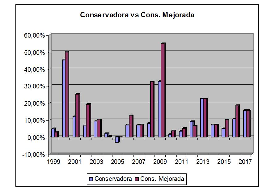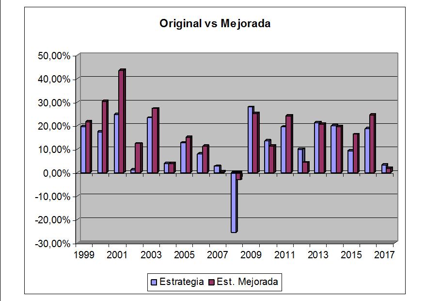 Como vemos, en muy raras ocasiones la «mejorada» cede posiciones frente a la estrategia conservadora original, teniendo varios picos con un desempeño francamente espectacular. La mejora no solo la vemos en la rentabilidad, sino que también observamos como eliminamos la aparición de años de rentabilidad negativa. El peor dato lo obtenemos en el año 2005 con un +0.11%.