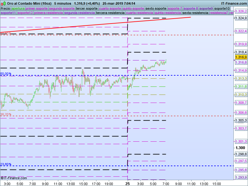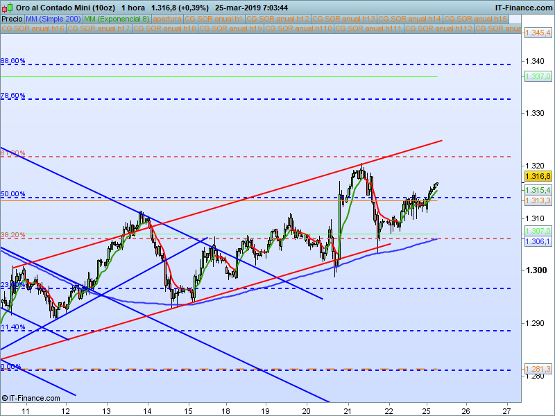 De Nuevo enredando en el SOR 1313. Vamos a volver a fijarnos en la base del canal alcista de muy corto plazo dibujado en rojo. Su pérdida de nuevo nos predispone a buscar zonas de PAA. Mientras estemos por encima de 1313 nos podemos fijar a muy corto plazo en el retroceso del 61.8% de la anterior caída.