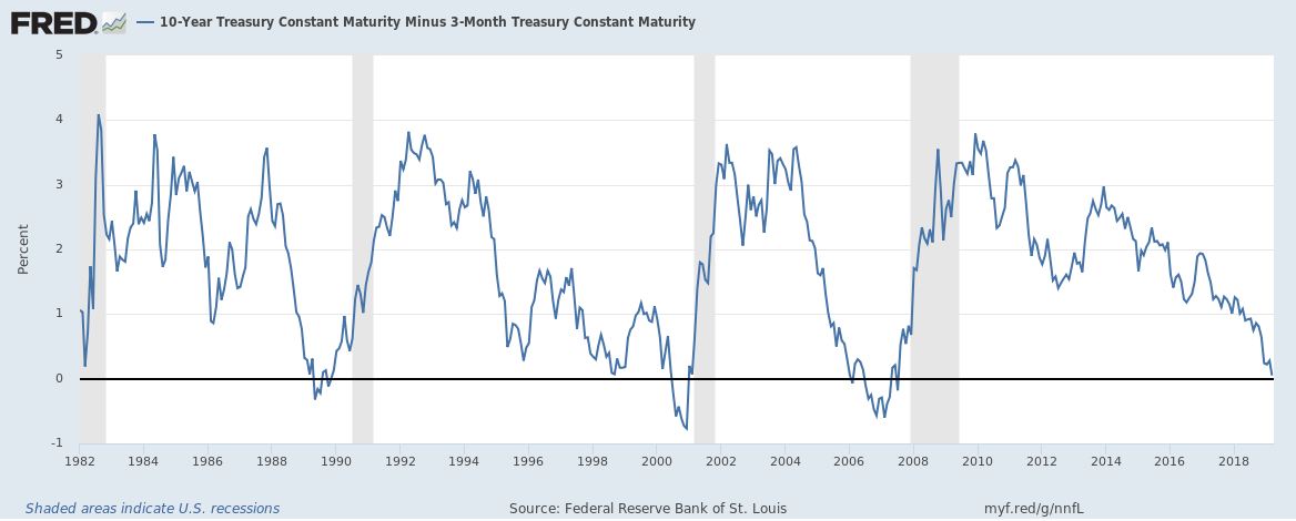 Tradicionalmente, la medida que tradicionalmente se usa es la diferencia entre el bono de 10 años y las notas a 2. Este tramo aún permanece «sano» y aunque muy plano , continua con pendiente positiva. Pero se está mirando mucho el spread pagarés a 3 meses frente al bono del tesoro a 10 años, y este si que ya está claramente invertido. Seguro que este gráfico lo han visto en multitud de sitios en las últimas 48 horas, y más que lo van a ver: