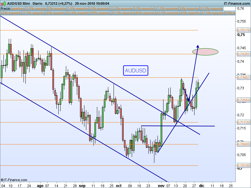 AudUsd.- Cuando parecía que íbamos a dar comienzo a un tramito a la baja, tuvimos el giro propiciado por el US dólar recuperando el SOR 0.72553 con mucha claridad. Mientras permanezcamos por encima de esta cota predisposición alcista. Cierres por encima de 0.73407 nos llevan al 0.74281
