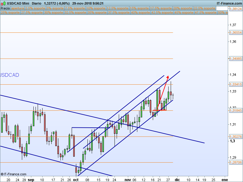 UsdCad.- Alcanzamos objetivo 1.33415 y giramos con fuerza hasta la base del canal. Dólar americano perdiendo fuerza y Cad débil por el mal comportamiento del petróleo… podemos entrar en un lateral entre los SOR 1.33415 y el 1.31845.