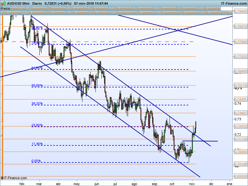 AudUsd.- La estructura bajista quedó rota con la perforación de la linea horizontal trazada en azul. Para buscar posiciones alcistas habría que buscar un retroceso. Un primer objetivo puede estar en el SOR 0.74281 y en extensión el 0.75176