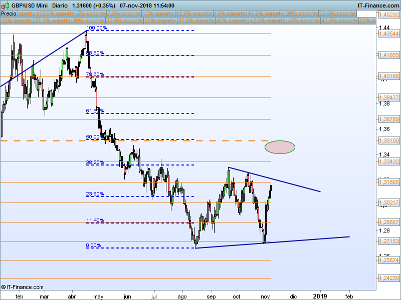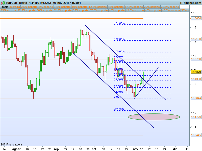 EurUsd.- Hemos roto el canal bajista que veníamos siguiendo. En estos momentos el precio se ha parado en el 61.8 del retroceso del último impulso bajista. Podemos estar ante una corrección en ABC que quedaría invalidada si el precio continua avanzando hasta el SOR 1.15768. La rotura de la 0B nos predispone a buscar el SOR anual 1.11729.