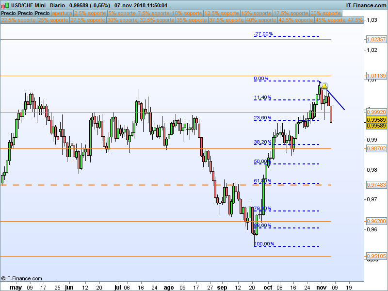 UsdChf.- El precio se giró sin tocar el SOR 1.01139, eso es signo de debilidad. Cierres por debajo del SOR 0.99920 deben predisponernos a buscar el 0.98702. El 61.8 de retroceso de este impulso alcista está precisamente en el PAA.