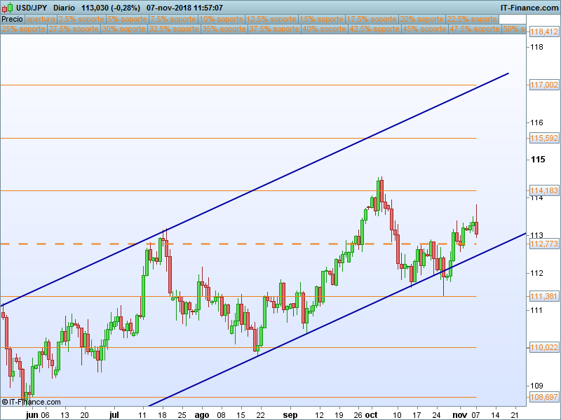 UsdJpy.- Nos preocupa el rechazo que estamos teniendo sin llegar a alcanzar el SOr 114.183. Nuestra predisposición es ir a buscar la zona alta del canal, cierres por debajo de 111.381 invalidan el recuento.