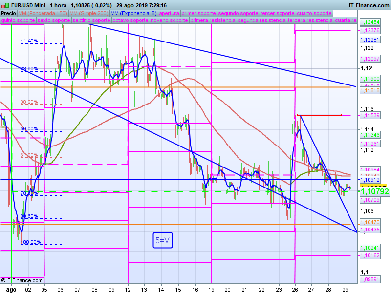 Si bajamos a gráficos de H1 y nos centramos en el tramo que viene desde principios de Agosto en donde realizamos el mínimo anual, vemos como el primer impulso alcista que nos llevó a 1.1250 y que parecía ser el inicio de una nueva tendencia alcista ha sido retrocedido bastante por debajo del 61.8% de Fibo, lo que hace que se incrementen las probabilidades de ver el precio de nuevo en mínimos. Sin embargo el precio de apertura mensual en 1.1079 está sujetando la cotización repetidamente desde el pasado 16 de Agosto. Puede que este sea la zona de control decisiva desde donde parta el siguiente impulso.