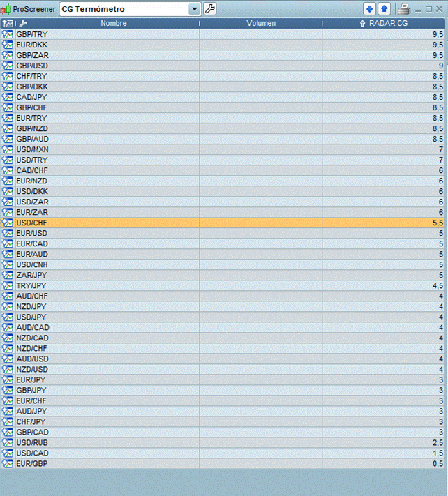 «CG Termómetro» es un screener o buscador programado especialmente para la plataforma gráfica ProReal Time y realiza una evaluación técnica tomando como referencia indicadores tendenciales, de momento así como de volatilidad. El indicador ordena de 0 a 10 el aspecto técnico de cada activo. Antes de tomar cualquier decisión respecto a los valores aquí señalados, recomendamos revisar la estructura del precio y la situación de la cotización respecto a zonas de soporte o resistencia relevantes.