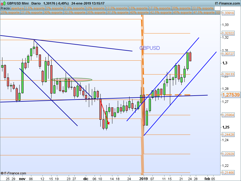 Alcanzamos el objetivo SOR 1.30727 y de momento encontramos rechazo. Mientras estemos por debajo podríamos pensar en buscar apoyos en la base del canal, en el SOR 1.2913
