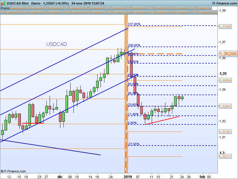 Hemos alcanzado el 38.2% de la corrección. Mientras estemos por encima del SOr 1.3294 el objetivo debe ser alcanzar el SOR 1.3458. Por debajo del 1.3294 tendremos posibilidad bajista hasta el SOR 1.3134