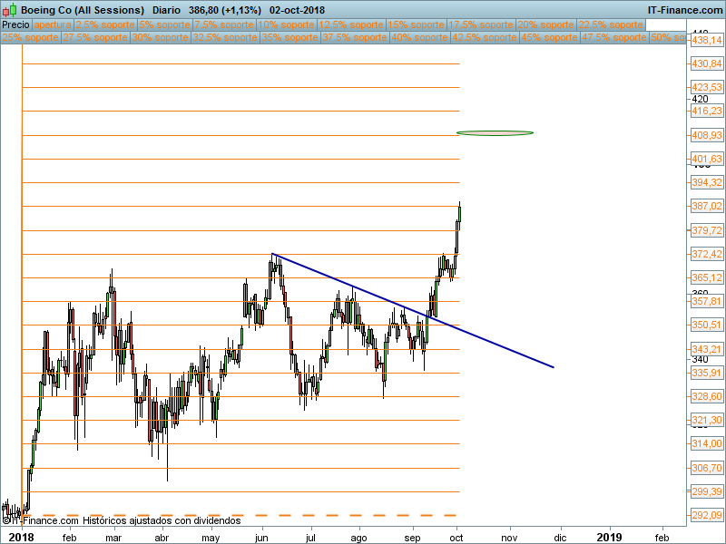 Boeing se ha pasado todo el 2018 lateralizando sin perder la secuencia de mínimos crecientes. La rotura de la 0-B nos activó la entrada en el valor y la rotura del SOR anual 372 nos ha confirmado la rotura de este lateral. Nuestro primer objetivo lo tenemos en el SOR 408.93, y el segundo en el 438.14.