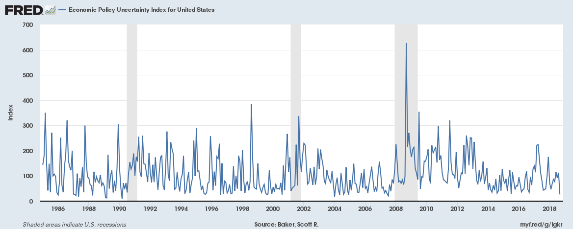 Gráfico del dia. 25/09/2018 Publicado por Analista1el 25 septiembre, 201827 septiembre, 2018Hoy traemos el gráfico del índice de incertidumbre en la política económica de EE.UU. Actualmente tenemos un dato muy bajo. Parece que los analistas tienen muy claro por donde van a ir los tiros del FED. Seguir leyendoArtículo anterior Recta final de mes, ¿qué podemos esperar?Artículo siguiente Mapa de refugios históricos: CAC40